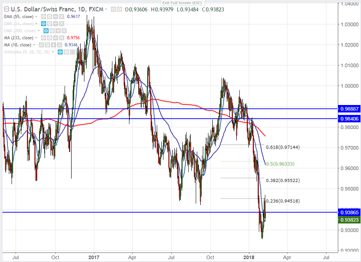 - USD/CHF has declined more than 100 pips from the yesterday high of 0.94698. The pair declined till 0.93484 and is currently trading around 0.93939.