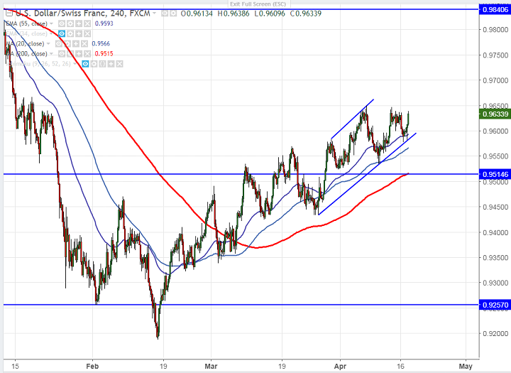 - USD/CHF has once again recovered after showing a decline slightly below 0.9600. Market doesn’t give much negative reaction to Syrian airstrikes. The risk appetite has been increased and global stocks has shown a good recovery from yesterday’s low. This has reduced demand for safe haven assets. It is currently trading around 0.96298.