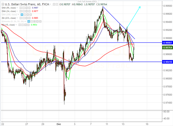 - USD/CHF has shown huge jump almost 50 pips after SNB monetary policy meeting .SNB has kept its interest rates unchanged in its quarterly interest rate setting decision. SNB’S Jordan said that CHF still overvalued and upgraded its inflation target to 0.7% from 0.4%. The pair hits high of 0.98843 and is currently trading around 0.98720.