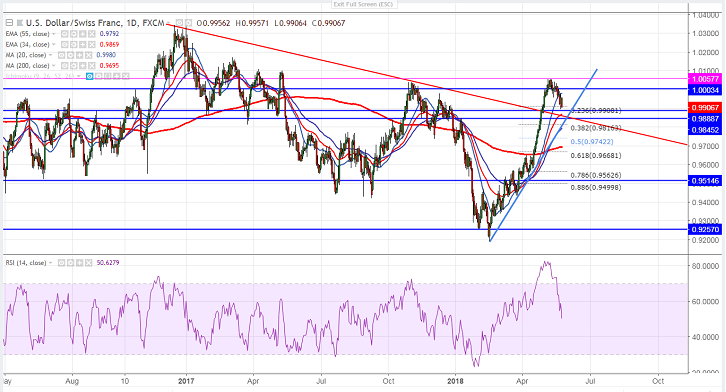 - USDCHF is declining sharply for the past two weeks and hits 3 -1/2 week low. The main reason for jump in Swiss Franc is risk –off mood boosts safe haven demand. The Trump’s warning regarding impose of import tariff on foreign vehicles and renewed trade war between US and China are increasing geo political concerns. The pair almost formed almost a double top at 1.00560 and shown a more than 150 pips dip from that level. Any convincing break below 0.9900 confirms minor weakness and a dip till 0.9800 is possible.