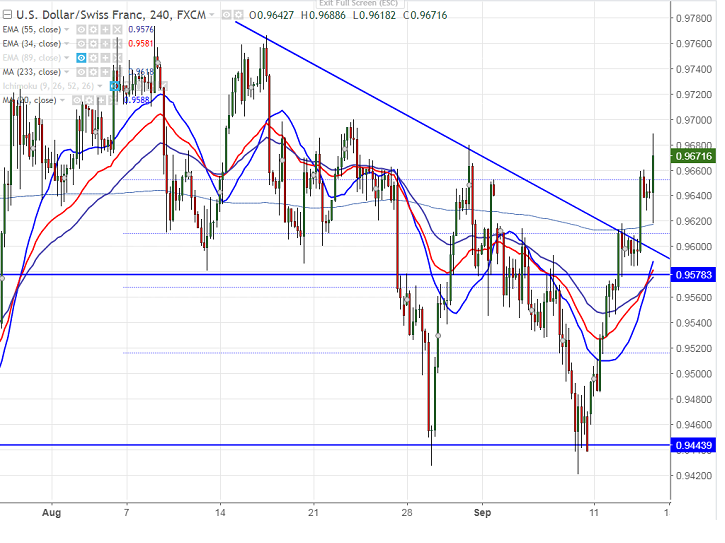 - USD/CHF has shown a minor decline from the high of 0.96579 after SNB has commented that significant overvaluation of CHF has been reduced. The pair hits intraday low of 0.96182 and jumped sharply from that level. It has broken yesterday high of 0.96605 and is currently trading around 0.96744.