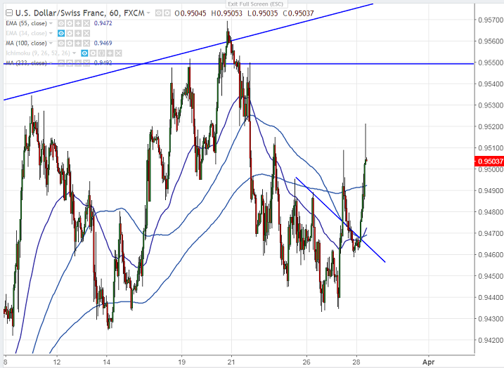 - USDCHF has been trading on the higher side in today’s Asian session. The pair hits low of 0.94585 yesterday’s US session and shown a good recovery on easing US-China trade war. The increase in risk appetite has dragged the prices of Swiss franc which is considered as safe haven asset. The pair hits high of 0.95212 at the time of writing and is currently trading around 0.95223.