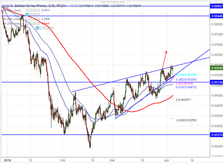 - USD/CHF was highly volatile in European session. The pair declined sharply almost 40 pips from the high of 0.95990. The minor profit booking in this pair was mainly due to new trade war worries between US and China. U.S has imposed 25% trade tariffs for 1300 products including industrial technology, transport and medical property. The pair hits low of 0.9550 and shown a minor recovery. It is currently trading around 0.95853.