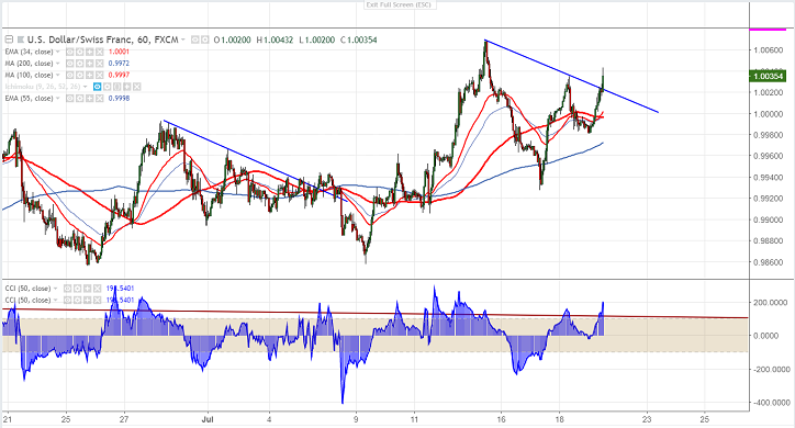 - USD/CHF has shown a huge recovery of more than 150 on account of strong USD US 10 year bond yield hits 2 week high after hawkish comment by Fed Chairman Powell. He has mentioned that US economy is growing faster with job market remains stronger and inflation will stay near 2%. The central bank said it is on the track to gradually raise interest rates. The pair pared most of its loss made on Tuesday.US 2- year yield hits 10 year high at 2.6290% and spread between US -2 year and US 10 year yield has narrowed to 23 basis point. The downside is capped due to policy divergence between US fed and SNB.The pair hits intraday high of 1.00395. It is currently trading around 1.00373.