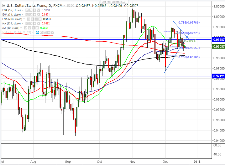 - USD/CHF was trading flat and declined almost 40 pips from the yesterday high of 0.98787. The pair is consolidating below 78.6% retracement at 0.9975. The pair was trading low due to slight weakness in US dollar index. The senate passed a landmark US tax bill early Wednesday and bill now needs approval from House of Representatives later Wednesday before signing by US president Donald Trump. US housing starts came at better than expected. It came at 1.297 million in Nov compared to forecast of 1.25 million. The pair hits low of 0.98348 yesterday and is currently trading around 0.98536.