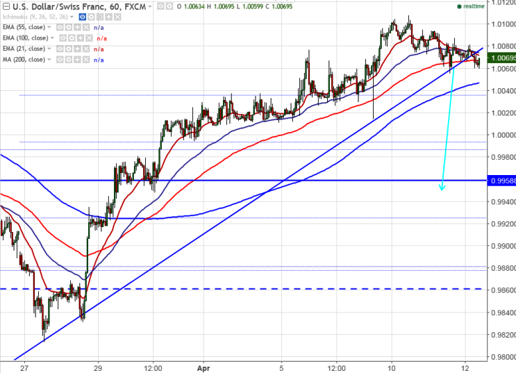 - USD/CHF formed minor top around 1.01078 on Apr 10th 2017 and declining from that level. The pair declined till 1.00557 and slightly jumped till 1.00875. It is currently trading around 1.00719.