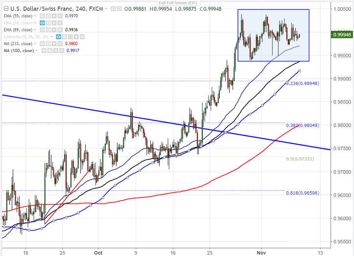 - USD/CHF is consolidating in narrow range between 0.99477 and 1.00378 for the past ten trading session. The pair declined slightly after US Senate Republicans are considering to delay corporate tax cut by a year. But it should break above 1.0040 for further bullishness. It is currently trading around 0.99947.