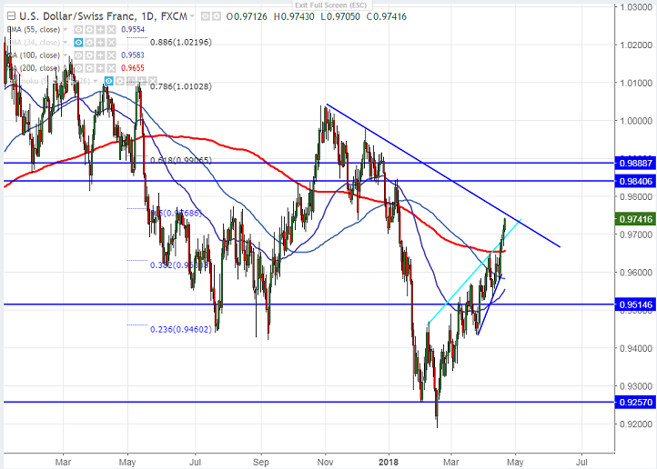 - USD/CHF was trading higher and jumped more than 70 pips. It hits fresh 3- month high at 0.97414. The Swiss franc was trading weak against all pairs as SNB Chairman Jordan said in interview that the depreciation of Swiss Franc is in right direction and there’s no need to change monetary policy at this moment. The easing geo political tensions in Middle East and Korea also supporting prices. It is currently trading around 0.97370.