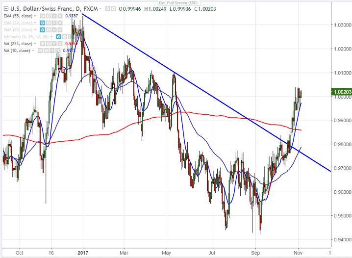 - USD/CHF has once again recovered after hitting low of 0.99477 on Friday. The pair jumped after slightly better than expected US jobs data. It is currently trading around 1.00204.