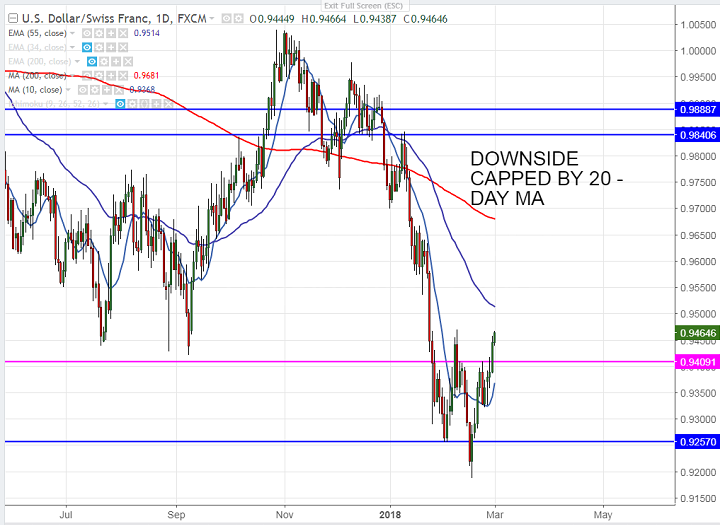 - USD/CHF continuing its bullish trend for fifth consecutive days and is trading well above 0.9410 level. The pair formed almost triple bottom at 0.9320 and any further weakness only below that level. The pair hits intraday high of 0.94619 and is currently trading around 0.94639.