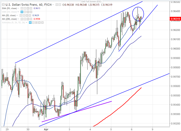 - USD/CHF has shown a minor selling pressure after hitting high of 0.96438 at the time of writing. The pair hits intraday low of 0.96199 and shown a minor recovery. The main reason weakness in Swiss franc is monetary policy divergence between Fed and SNB. It is currently trading around 0.95809. Market eyes US jobs data which is to be released today for further direction.