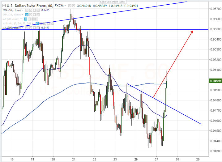- USDCHF has declined till 0.94345 and shown a minor jump from that level. The pair hits high of 0.94957 after breaking minor trend line resistance and is currently trading around 0.94952.