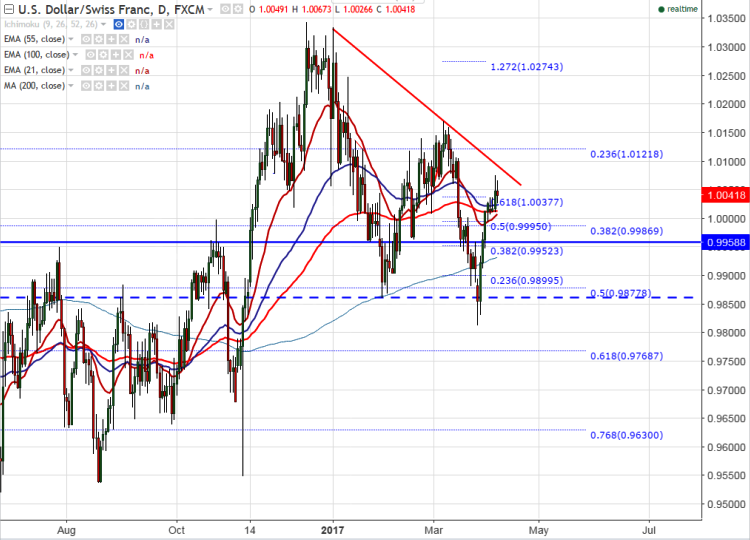 FxWirePro: USD/CHF trades lightly above 61.8% fibo, target 1.00950/1.01700