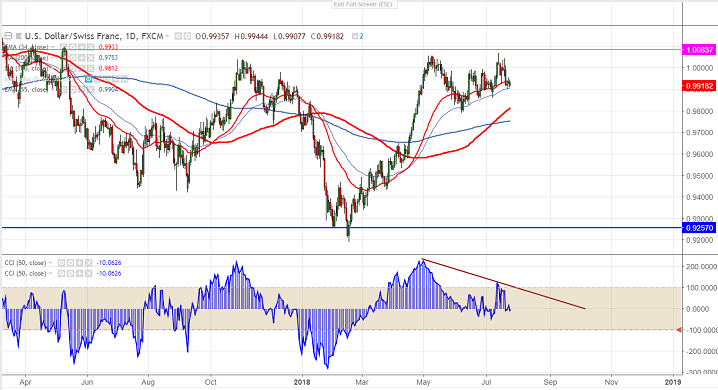 - USD/CHF is trading lower after a minor jump till 0.99577 yesterday. USD was trading slightly higher yesterday on hopes of better than expected US Q2 GDP which is to be released on Friday.The pair has declined more than 140 pips from the high of 1.00434 made on Jul 19th 2018. The escalating trade war between US and China and comments by Donald Trump on fed was the main reason for USDCHF selling. The increasing trade war tension has increased demand of safe haven asset like yen, Swiss franc and gold. US 10 year bond yield has shown a more than 1.5% decline after hitting high of 2.96%. US 2- year yield pared some of its gain after hitting 10 year high at 2.659% and spread between US -2 year and US 10 year yield has decreased from increased from 23 basis point to 34 basis point. The downside is capped due to policy divergence between US fed and SNB.The pair hits low of 0.99010. It is currently trading around 0.99187.