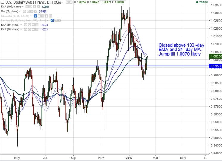 - USD/CHF recovers sharply from the low of 0.99297 yesterday and has broken major resistance at 1.000 (21- day MA).The pair jumped till 1.00240 at the time of writing. It is currently trading around 1.00234.