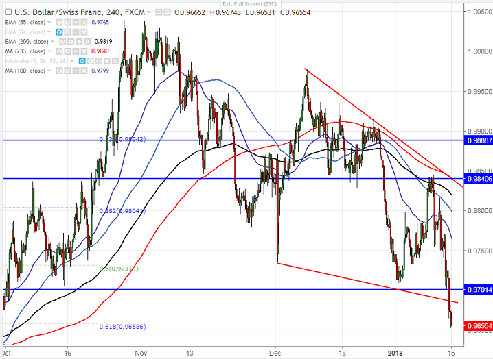 - USD/CHF declined almost 180 pips in previous week from the high of 0.98455 made Jan 10th 2018. The major decline was mainly due to good selling in US dollar index. The pair dipped till 0.96527and is currently trading around 0.96550.