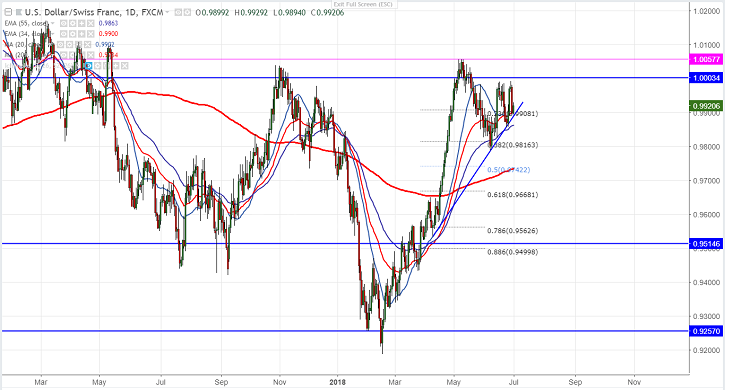 - USD/CHF has formed almost a double top around 1.000 level and started to decline from that level. The trade war between US and Mjaor economies especially with China is supporting CHF price. The increase in geo political tensions has rised demad for sawfe haven like Swiss franc.It hits high of 0.99925 in previous week and is closed around 0.9904. Swiss central bank is expected to keep interest rates for longer period and mentioned in previous meeting that it is closely watching political uncertainty in Italy and Oil.