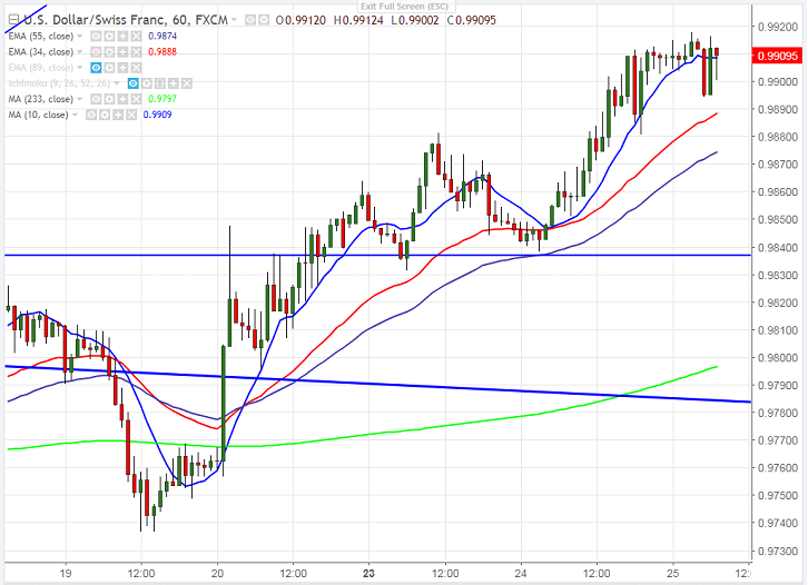 - USD/CHF has shown a minor jump after breaking convincingly 233- day MA and has broken high of 0.98812 and major resistance 0.9865 and closed slightly below that level. But the pair is still trading above trend line resistance. Short term trend is still bullish as long as support 0.9705 holds. The intraday weakness can be seen below 0.9880 level. It is currently trading around 0.9905. The main reason for dip in Swiss franc was mainly due to easing geo political tensions in North Korea which has reduced demand for safe haven assets.