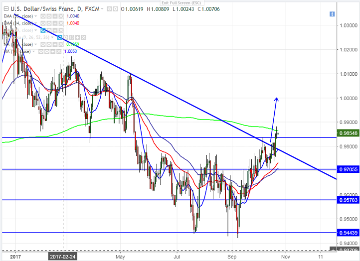 - USD/CHF has shown a minor selling after hitting high of 0.98812 yesterday and has broken major resistance 0.9865 and closed slightly below that level. But the pair is still trading above trend line resistance. Short term trend is still bullish as long as support 0.9705 holds. The intraday weakness can be seen below 0.9770 level. It is currently trading around 0.98570. The main reason for dip in Swiss franc was mainly due to easing geo political tensions in North Korea which has reduced demand for safe haven assets.