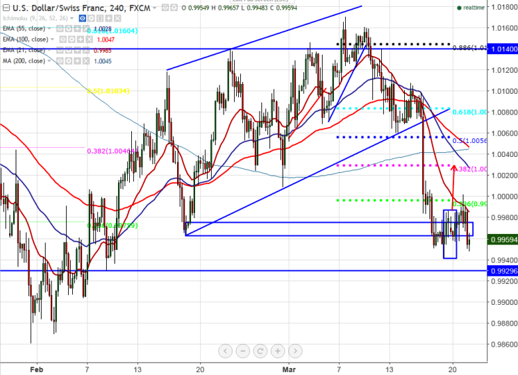 - USD/CHF has shown a minor jump till 1.000 and declined from that level. It is currently trading around 0.99538.