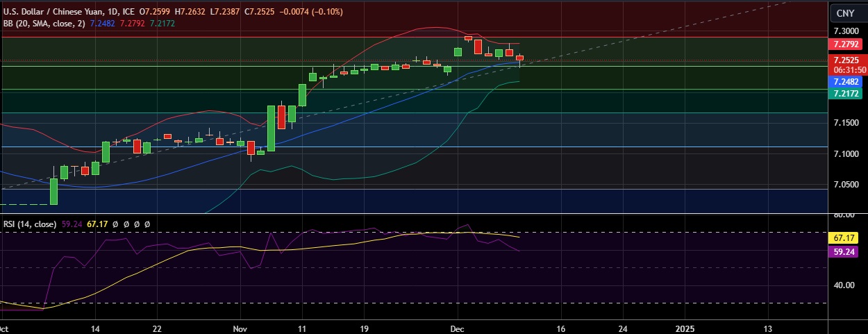 • Immediate resistance is located at 7.262 (Daily high), any close above will push the pair towards 7.280(Higher BB).