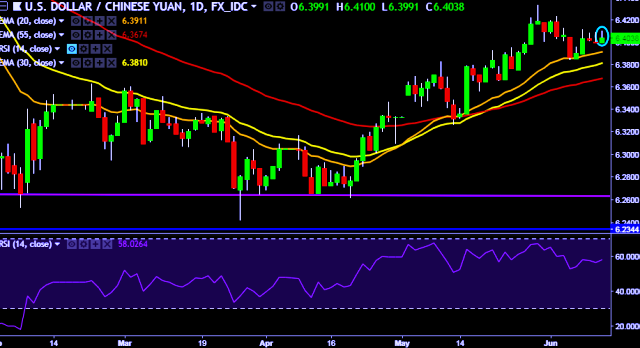 We prefer to take long position on USD/CNY only above 6.4110, stop loss 6.3889 and target of 6.4228/6.4329.