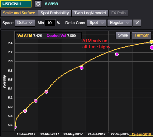 The biggest talking point of the New Year is the shellacking that China bears have received on consensus long USDCNY positions, engineered via the by-now familiar tool of raising FX implied yields to punitive levels. As you could observe from the diagram showing ATM and implied vols have collapsed and risk-reversals are also likely to collapse alongside the liquidation of USD longs, a chasm has now opened up between implied yields in CNH forwards and option prices that is testing historical extremes along a number of dimensions:
