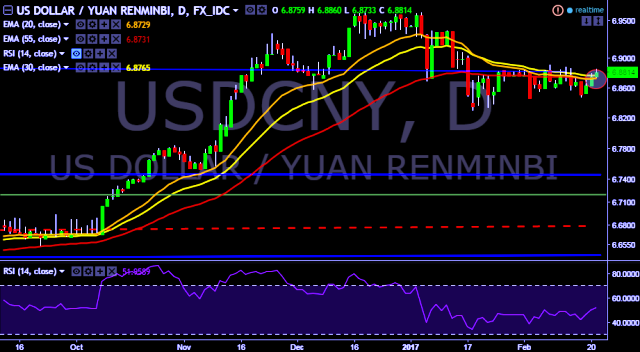 We prefer to take long position in USD/CNY around 6.8770, stop loss at 6.8639 and target of 6.9080.