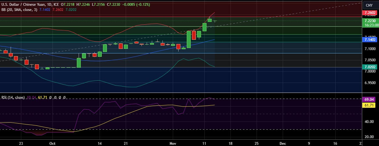 • Immediate resistance is located at 7.214(23.6%fib), any close above will push the pair towards 7.259 (Higher BB)