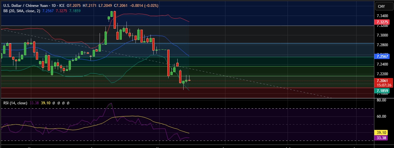 • At GMT 05:32, the dollar was down 0.02% to 7.206 against the Chinese Yuan.