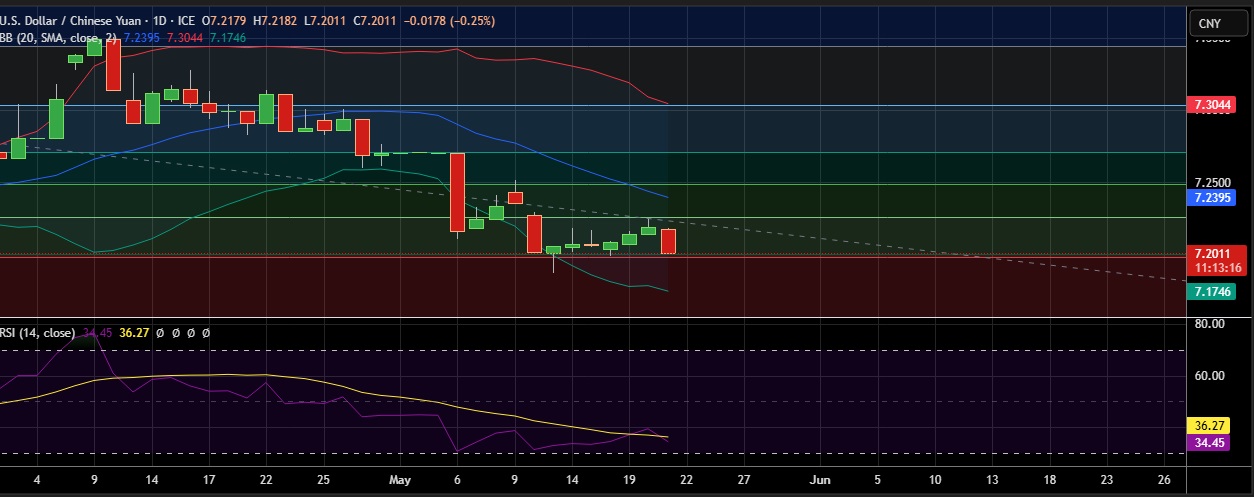 • Support is seen at 7.198(23.6%fib) and break below could take the pair towards 7.175 (Lower BB).