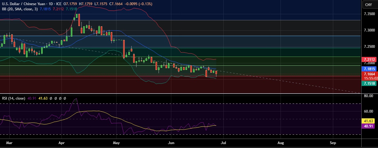 • Support is seen at 7.160(23.6%fib) and break below could take the pair towards 7.151 (Lower BB).