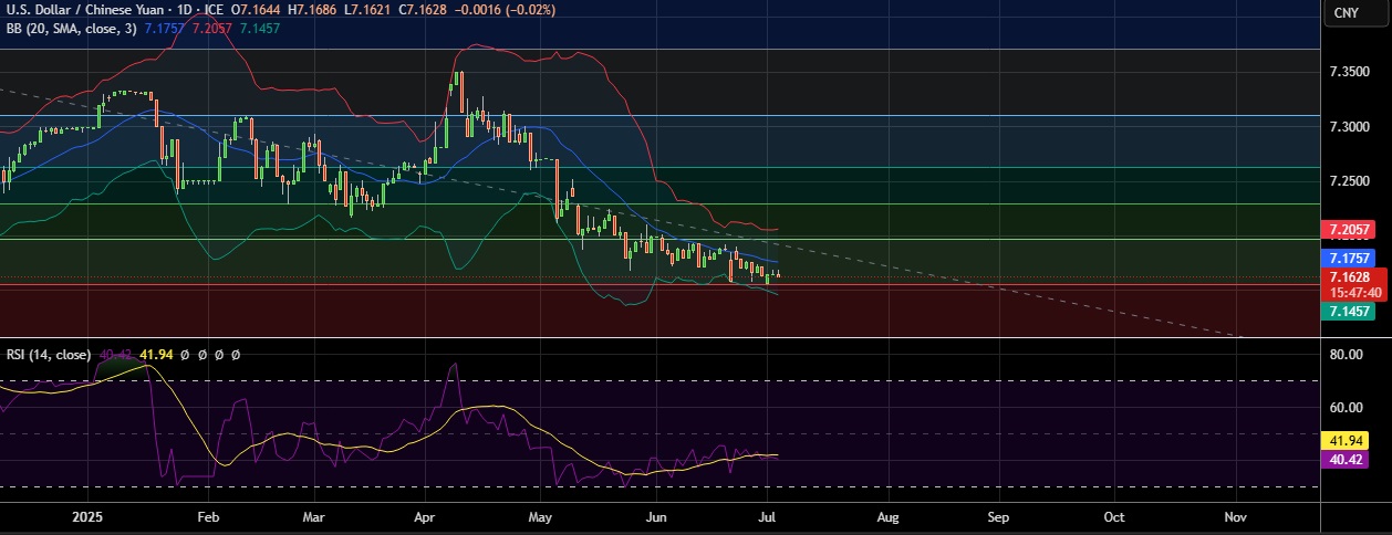 • USD/CNY edged lower on Wednesday as investors kept a close eye on global trade negotiations and their potential implications for China’s economic outlook..