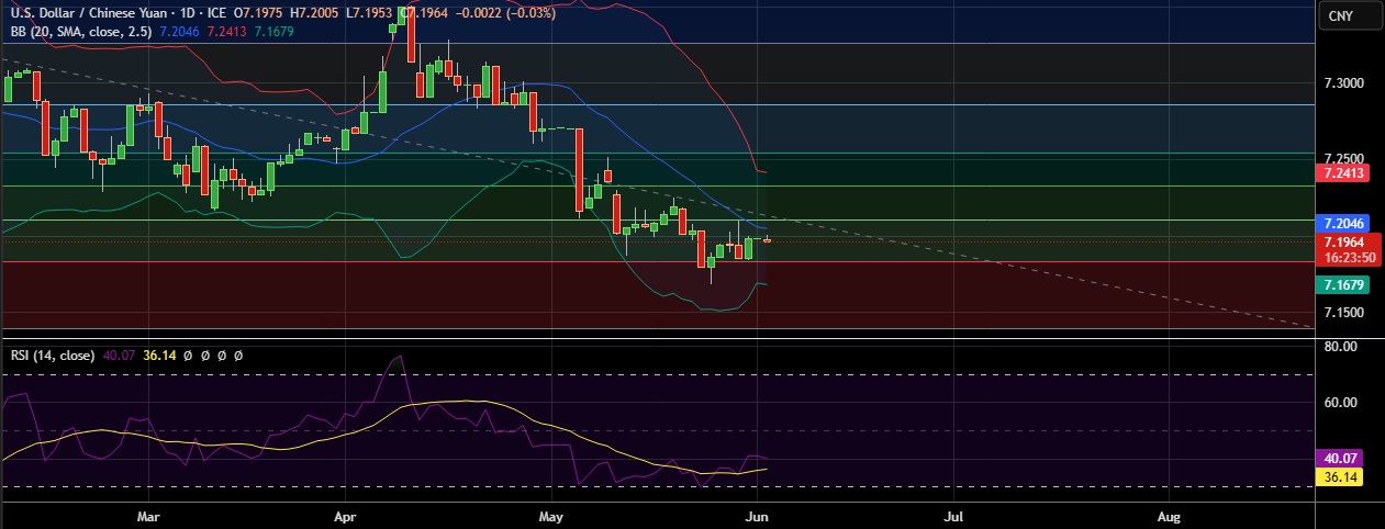 • Support is seen at 7.2183(38.2%fib) and break below could take the pair towards 7.169 (Lower BB).