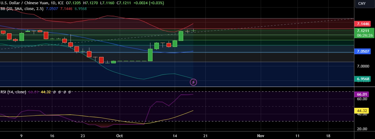 • Immediate resistance is located at 7.129(23.6%fib), any close above will push the pair towards 7.140 (Higher BB).