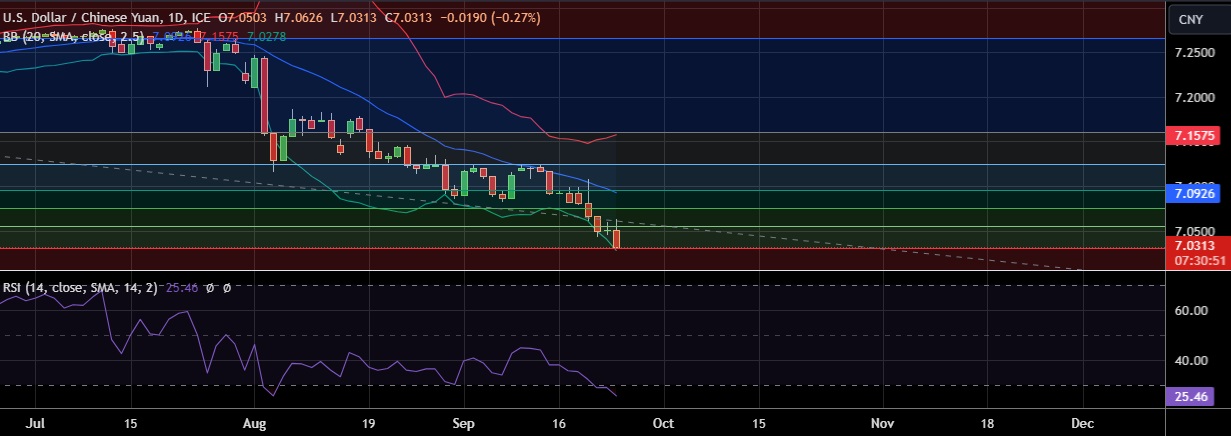 • Support is seen at 7.030(23.6%fib) and break below could take the pair towards 7.000 (Psychological level).