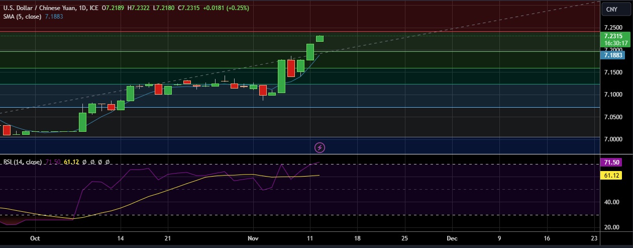• Support is seen at 7.219(Daily low) and break below could take the pair towards 7.196 (38.2%fib).