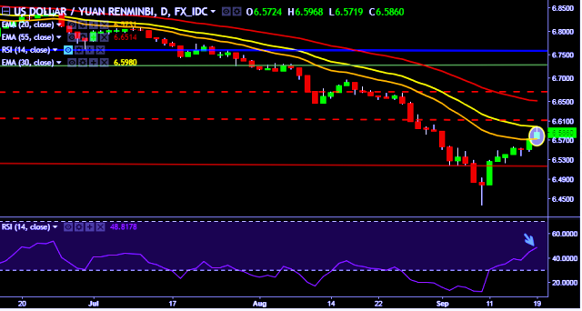 We prefer to take long position in USD/CNY around 6.5840, stop loss at 6.5690 and target of 6.6227.