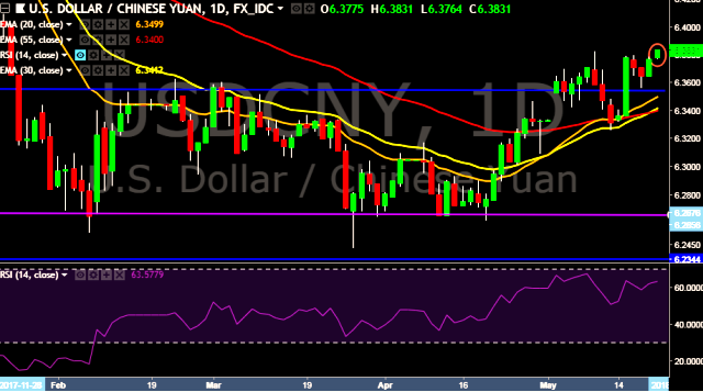 We prefer to take long position on USD/CNY around 6.3800, stop loss 6.3644 and target of 6.4017.