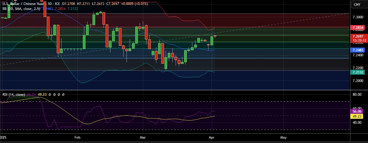• USD/CNY hit one month high on Wednesday as markets awaited clarity from U.S. President Donald Trump's reciprocal tariff plan.
