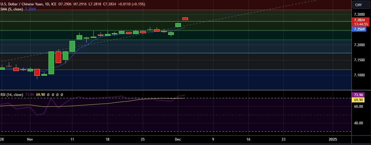 • Immediate resistance is located at 7.291(Daily high), any close above will push the pair towards 7.300(Higher BB)
