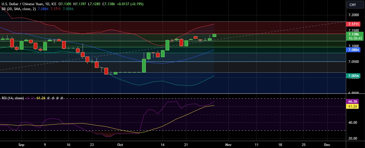 • Immediate resistance is located at 7.140 (23.6%fib), any close above will push the pair towards 7.168 (Higher BB).