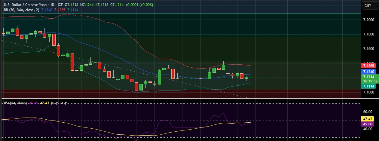 • Immediate resistance is located at 7.124(SMA 20), any close above will push the pair towards 7.137(Higher BB).