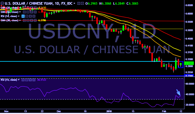 We prefer to take short position on USD/CNY only below 6.2800, stop loss at 6.3315 and target of 6.2584.