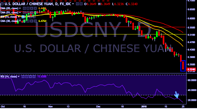 We prefer to take short position on USD/CNY around 6.3350, stop loss 6.3649 and target of 6.2765.