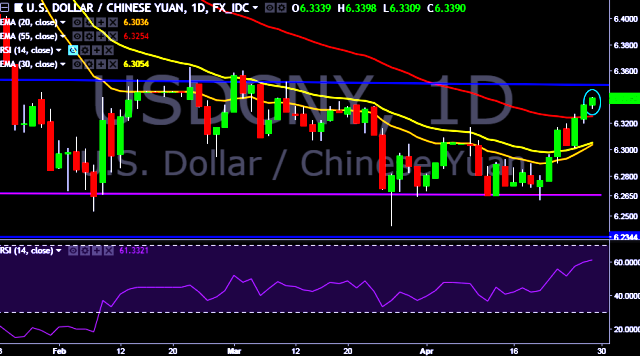 We prefer to take long position on USD/CNY around 6.3350, stop loss 6.3197 and target of 6.3515/6.3625.