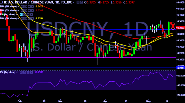 We prefer to take long position on USD/CNY around 6.3590, stop loss 6.3510 and target of 6.3821/6.4017.