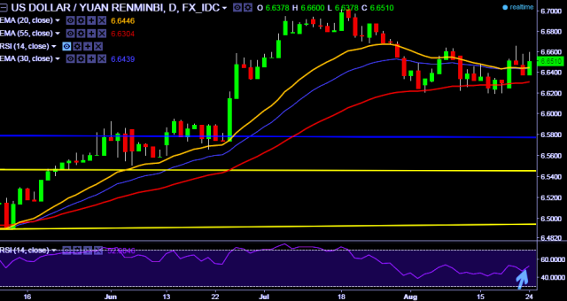 We prefer to take long position in USD/CNY around 6.65, stop loss 6.6250 and target 6.6766.