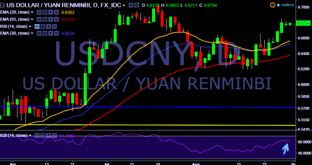 We prefer to take long position in USD/CNY only above 6.6820, stop loss 6.6670 and target 6.7017.