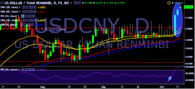 We prefer to take long position in USD/CNY around 6.7150, stop loss 6.6820 and target 6.7583.
